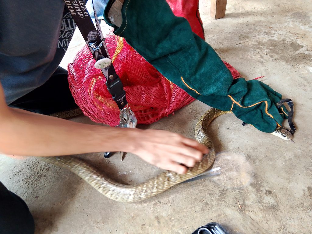 A clinical assessment revealed the snake to be in stable condition, with only minor abrasions and tick infestation noted as the primary concerns. No life-threatening injuries were found. The cobra is currently under close monitoring for full recovery, including wound management, parasite treatment, and observation for any potential visual impairments at University of Southern Mindanao (USM)-Wildlife Rescue Center.